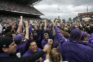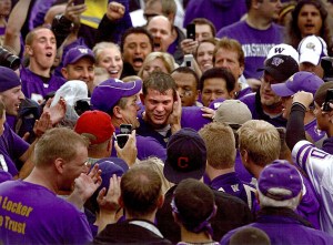 there. As I was jumping and yelling I felt a few tears in my eyes. I thought, “Andrew (I guess I talk to myself in third person), are you serious? Crying at a football game?” But then I looked around. There were 40 year-old men standing next to me wiping away tears. For the next ten minutes I wandered around by myself, trying to soak up every minute possible. I stood and watched Jake hug his dad, Nick Holt do an interview where the reporter couldn’t hear him, E.J. Savannah cry, and the older season ticket holders stand and applaud from their seats. I found Dan, Jess, and Katie and many hugs were exchanged. That night I went to one of my homes (Matthew and Lisa’s) and watched it again. I’ve watched that game-winning drive countless times but I still get goosebumps when I see all of the purple rush on to the field.