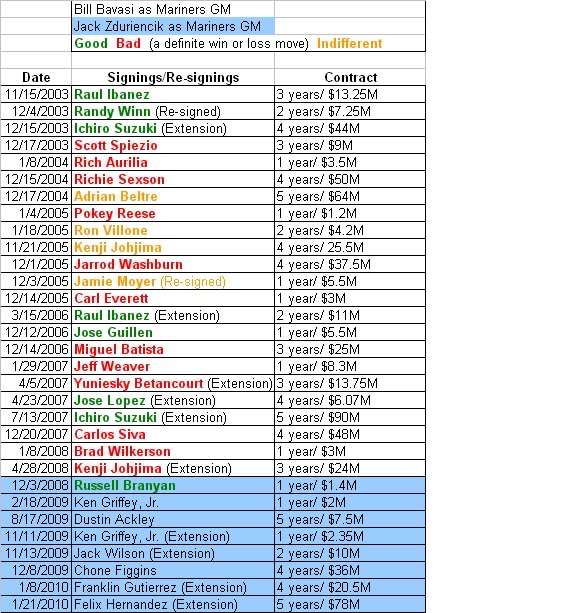 Again, I find it beneficial and uplifting to look at Jack Zduriencik’s body of work, and so here is a summary of his signings thus far. Of the 8 most notable signings, 1 was a definite success (Branyan), and none appear to be bad moves thus far. Better yet, the largest contract Jack has given to a free agent is to Chone Figgins, for the reasonable price of $36 million. Jack has also done well to lock up arguably the three most important players for the future in Ackley, Gutierrez and Felix Hernandez.
